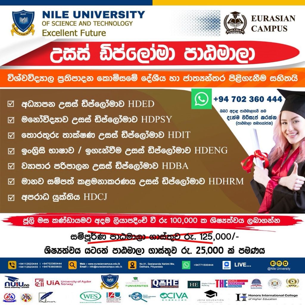 With the Higher Diploma in various field of studies from Eurasian Campus, Sri Lanka affiliated by Nile University of Science and Technology, Mogadishu, learn the skill with the knowledge and abilities you gain from our program, you will be able to significantly improve people’s capabilities. With the help of our knowledgeable instructors, investigate the many sides of studies and set out on a path to a fulfilling profession in this vital area. Come along with us and become a part of a community that is committed to improving the knowledge.